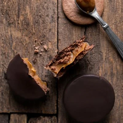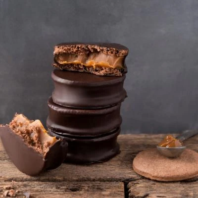 Alfajor de chocolate, son dos galletas suaves, que abrazan un cremoso dulce de leche, todo envuelto en una seductora capa de chocolate semiamargo. Cada bocado es un abrazo dulce que alegra el alma y despierta sonrisas. ¡Un clásico que siempre conquista!