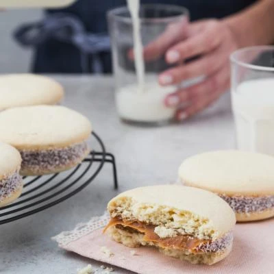 Alfajor de maicena, dos galletas suaves abrazan un cremoso dulce de leche y coco. Alegra el alma y despierta sonrisas. ¡Un clásico que siempre conquista!